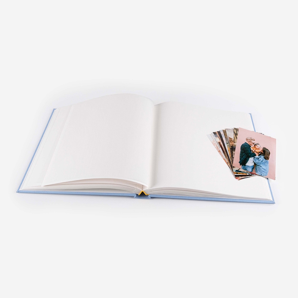 O álbum de fotos com janela para colar fotos tem folhas resistentes separadas por papel vegetal e capa de cartão resistente revestida de linho.