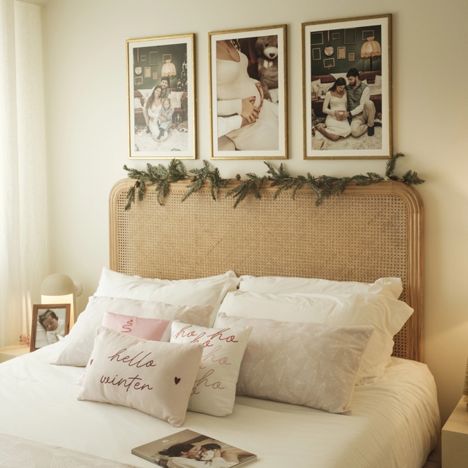 Podes adicionar almofadas de Natal, mantas fofas e quentes, e até molduras com fotos de Natais anteriores. As velas também são ótimas para criar um ambiente aconchegante e acolhedor.